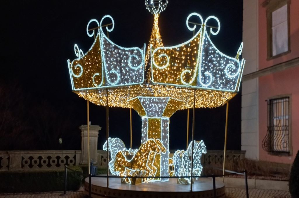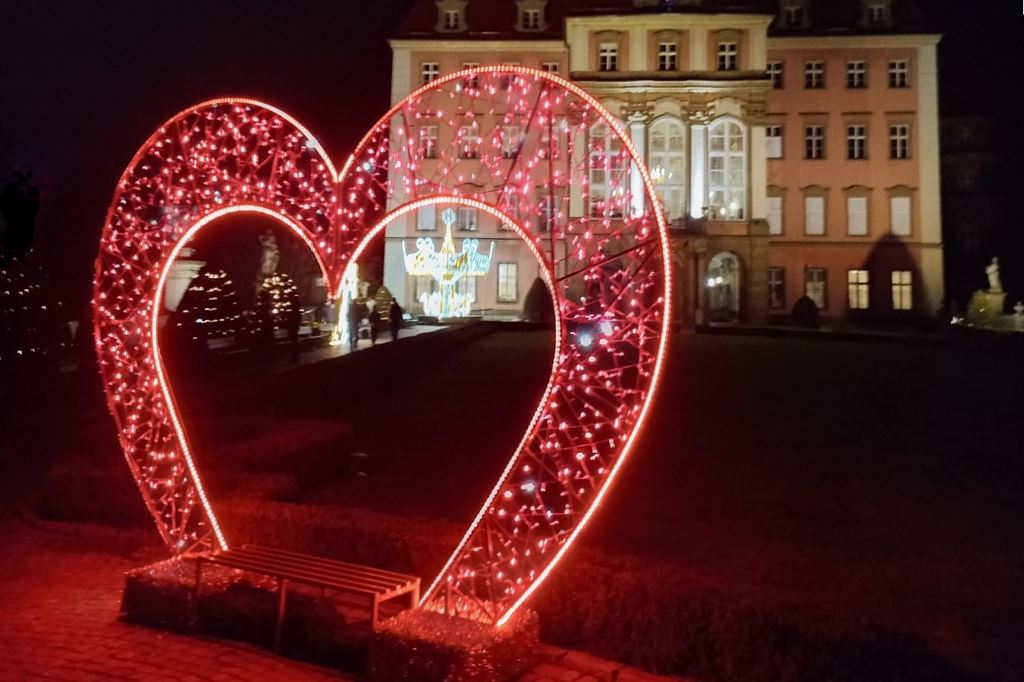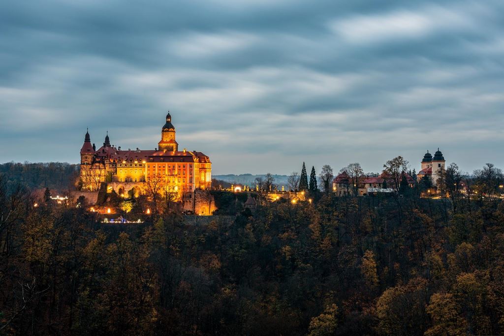 Krásně osvětlené dekorace na terasách zámku Książ.